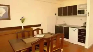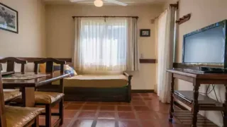 Posee luminosos departamentos estilo cabaña (pisos rústicos y muebles clásicos de algarrobo).